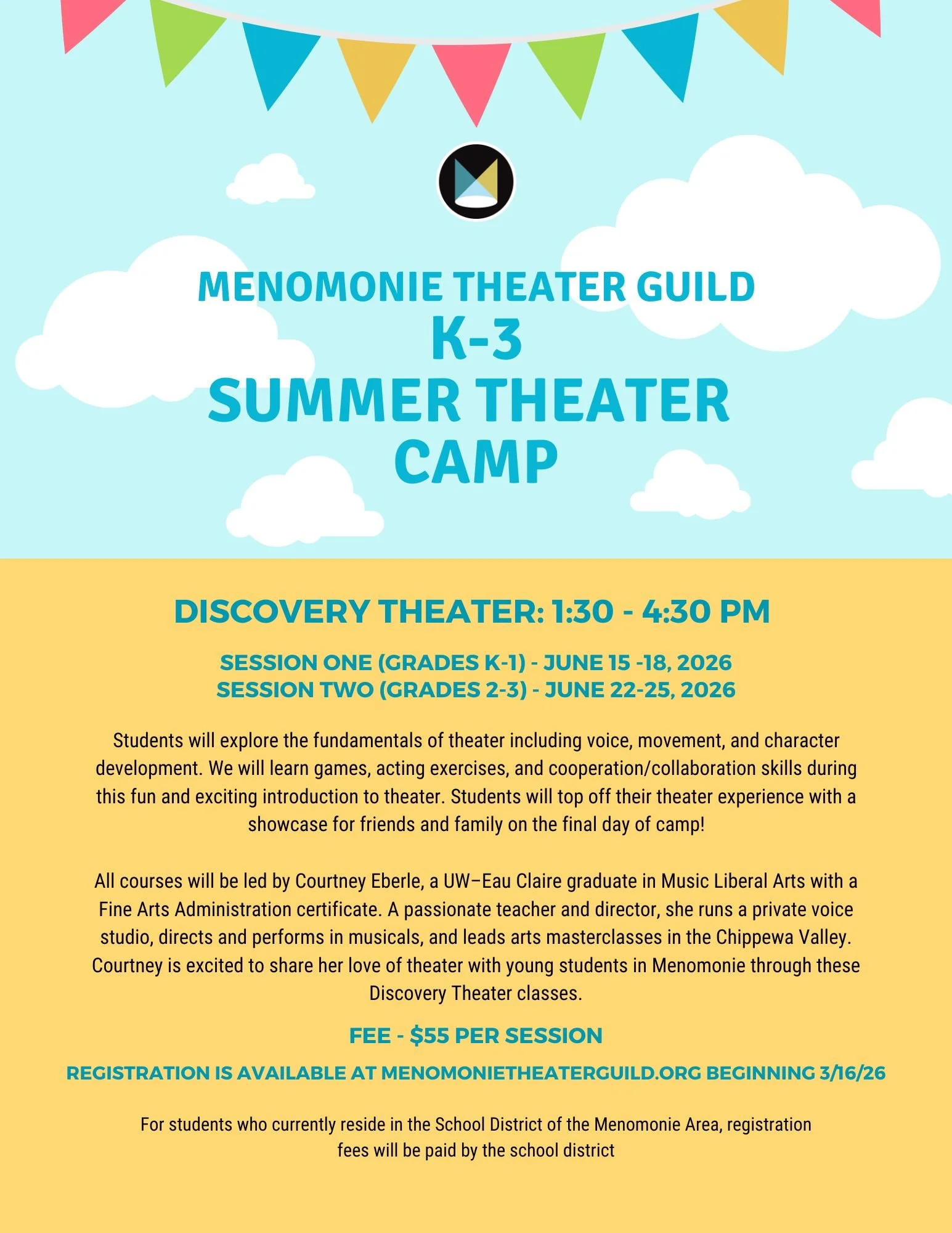 First up we have our camp for the youngest thespians. Geared toward those students in grades K-3, this class is a perfect introduction to the joys of theater for your little ones. We will explore the fundamentals of theater including movement, voice, imagination, and character creation. Sign up for camp begins on March 16, 2026. For students residing in the School District of the Menomonie Area, registration fees will be paid by the school district.